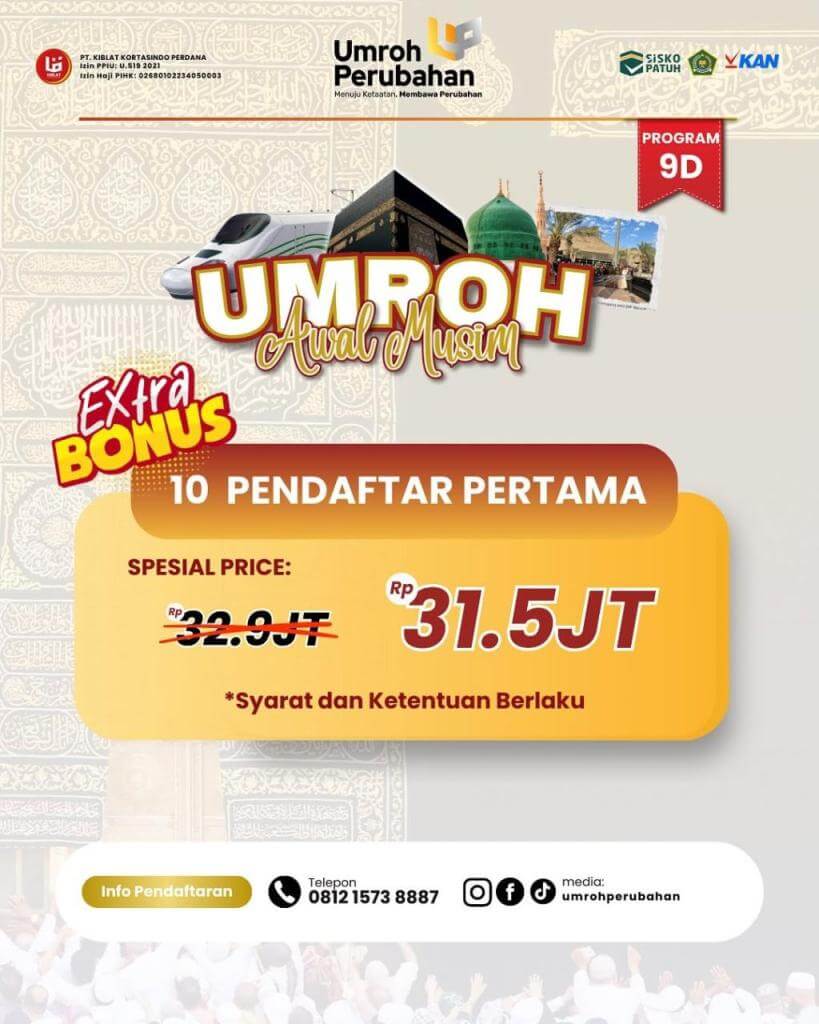 Kuota terbatas! Diskon untuk 10 pendaftar pertama masih tersedia. Hubungi kami sekarang juga dan bersiaplah untuk perjalanan spiritual yang penuh berkah.